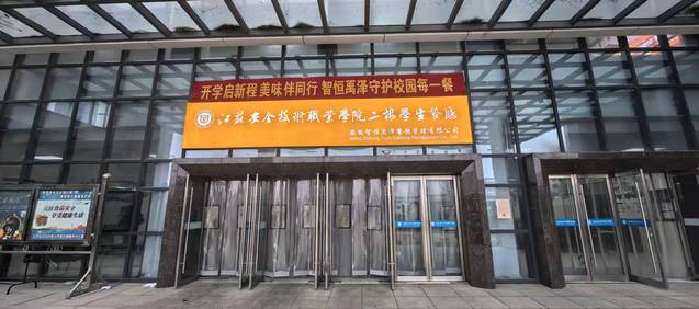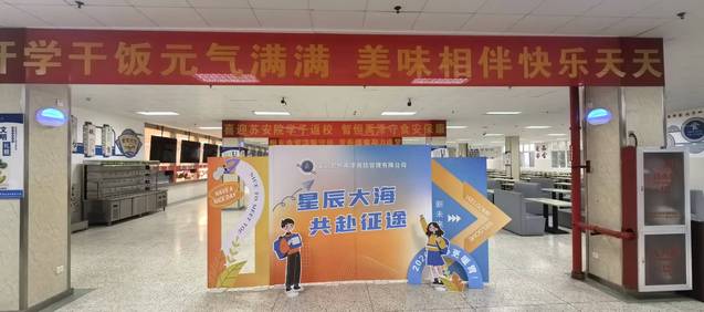 学生食堂内外洋溢着浓厚的迎新氛围。正门口的红色横幅格外醒目,“开学启新程 美味伴同行”既是食堂的迎新宣言,又饱含着对师生的美好期许;就餐大厅内,主题展牌错落摆放,“星辰大海共赴征途”、“2026暖心更暖胃”的温馨话语让师生踏入食堂便倍感亲切。